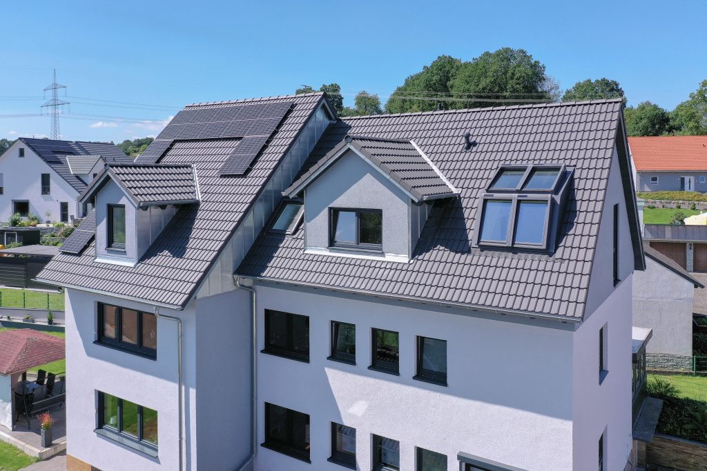 Um im Spitzboden Wohnraum zu gewinnen, haben wir den Kniestock etwas erhöht, die Dachneigung von 30° auf 45° geändert und insgesamt drei Dachgauben errichtet.