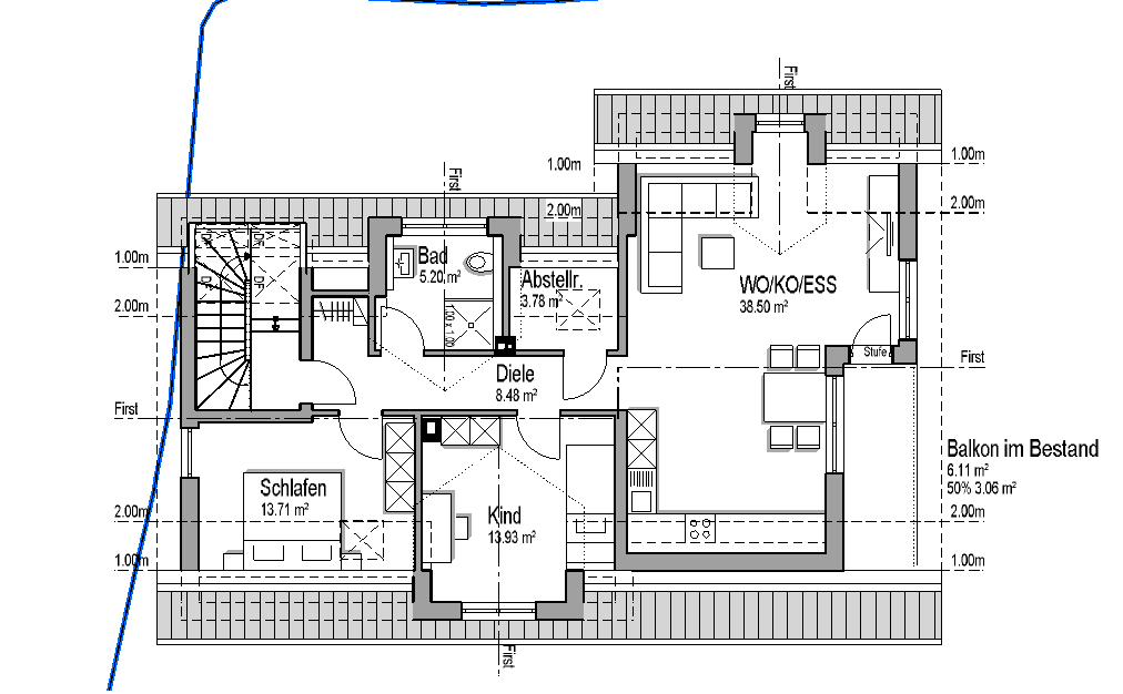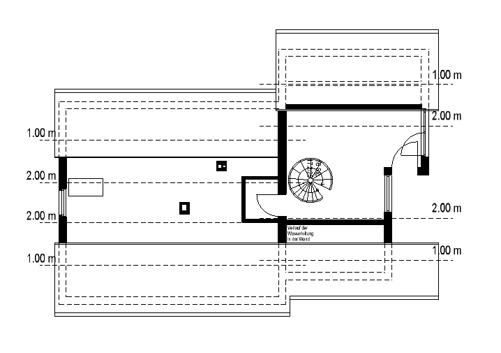 Da die Kopfhöhe nicht ganz ausgereicht hat, um mit dem Haupttreppenhaus ins Dachgeschoss zu kommen, haben wir uns hier eine spezielle Lösung mit einem besonderen Dachflächenfenster einfallen lassen. Eine zusätzliche Gaube wäre nicht möglich gewesen, da wir die maximale Fläche, die in diesem Baugebiet erlaubt ist, schon eingeplant hatten. Zusätzlich bietet das großzügige Fenster natürlich viel Licht im Treppenhaus.